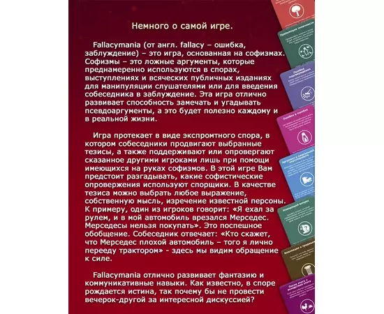Fallacymania — игра про софизмы. Софизмы — это псевдоаргументы, которые намеренно используются в дискуссиях, выступлениях, статьях и т. п. для введения оппонента в заблуждение или манипуляции аудиторией.