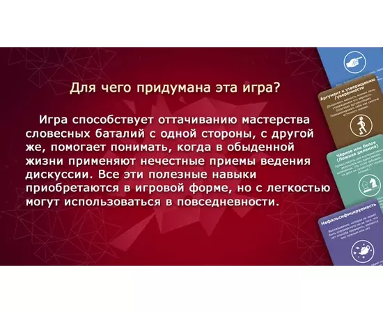 В ходе игры участники приобретают навыки замечать и узнавать псевдоаргументы — и не только в игровых ситуациях.
