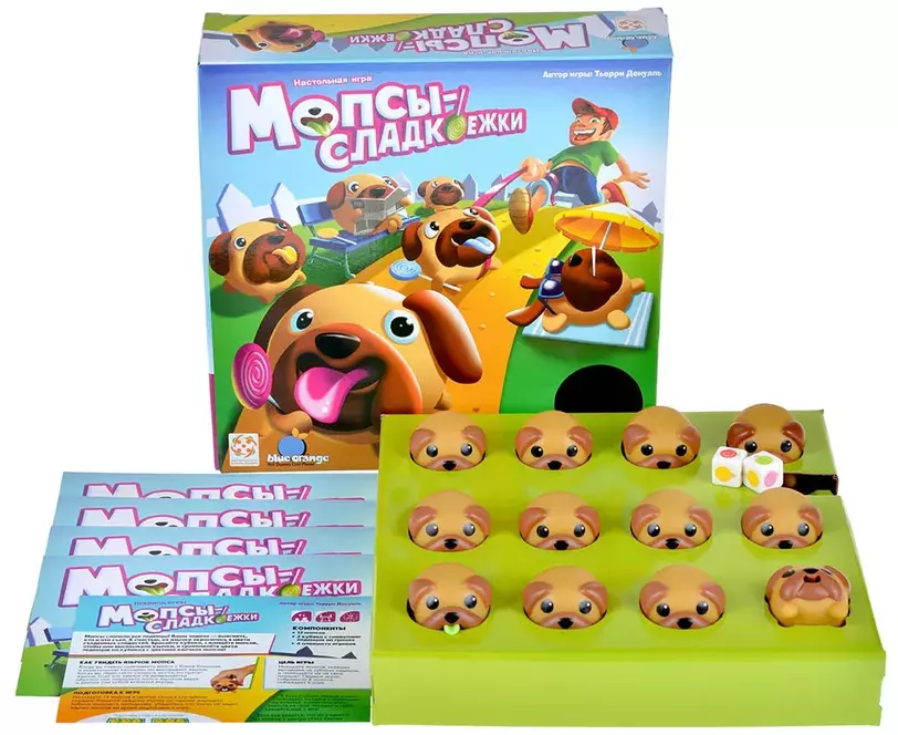 Мопсы слопали все леденцы!К счастью, их язычки окрасились в цвет съеденных сладостей. Ход за ходом старайтесь выяснить, кто из мопсов съел леденцы тех цветов, которые выпали на кубиках. Когда вы аккуратно сжимаете милых пёсиков, они показывают свои цветные язычки! Как бы обаятельны они ни были, этим проказникам не удастся улизнуть просто так... Первый игрок, собравший у себя 6 мопсов, победит!