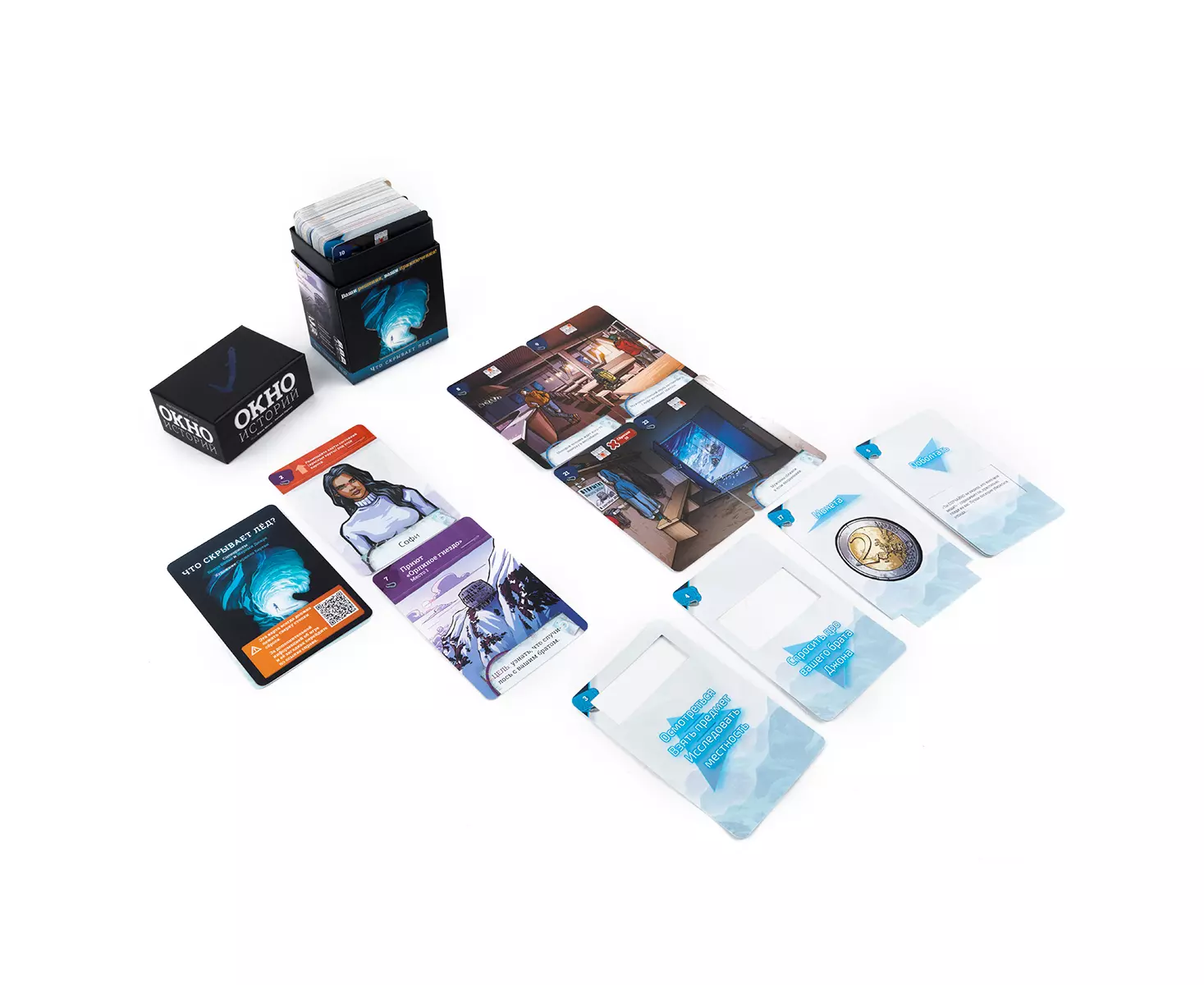 Серия «Окно историй» — это приключенческие повествовательные игры, в которых вы действуете в роли того или иного персонажа. В играх серии вы будете разгадывать головоломки и принимать влияющие на сюжет решения. В отличие от некоторых других игр жанра, в данной серии представлена интересная механика, которая отчасти может напомнить компьютерные игры, в которых вы взаимодействуете с пространством и предметами, окружающими героя. У вас будут карты обстоятельств, которые показывают всё, что окружает персонажа, а также карты действий с окошками или выемками, которые представляют собой варианты действий, предметы или другие объекты, которые можно использовать для взаимодействия с картами обстоятельств. А сама механика взаимодействия проста: вы выбираете карту действия и прикладываете её к оборотной стороне карты обстоятельств, а затем переворачиваете и смотрите видимую информацию.
